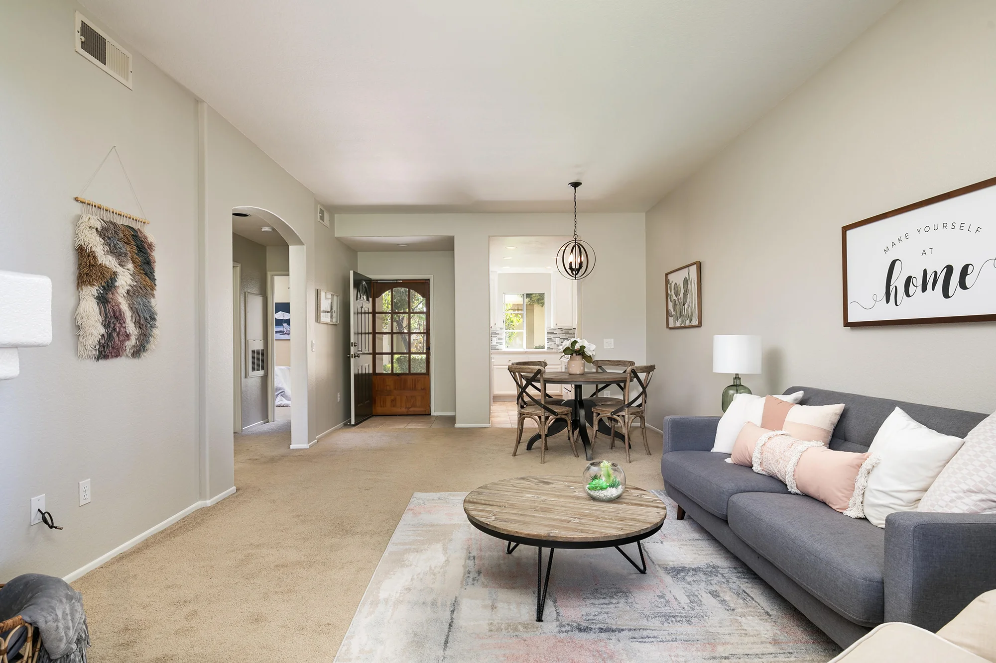 Location is everything, but so is decor! This adorable condo in Rancho Santa Margarita sits right on a serene golf course, so we thought we would bring the beauty of desertscape to this lovely place. From the soft pinks, to the neutral tans and whites, to the use of metals and woods, we think this place feels move-in ready and fabulous!